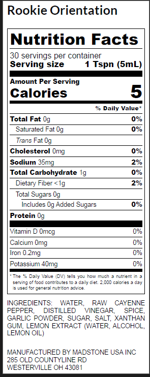 As a garlic lovers' dream, Rookie Orientation features lots of fresh dried garlic and Cayenne peppers. Fairly mild as far as hot sauces go- think "Frank's" or "Louisiana Red Hot" with lots of garlic and a bit more attitude. With a vast amount of Cayenne peppers, this sauce has a more than respectable heat level.